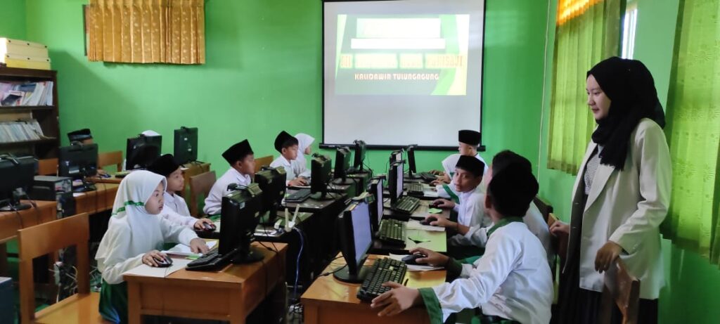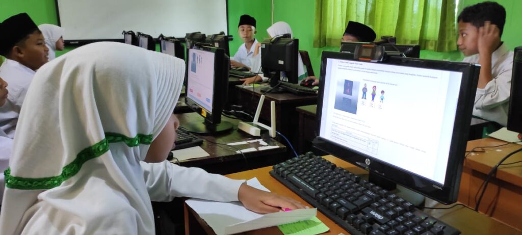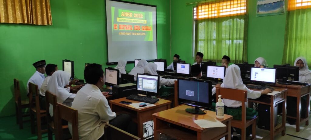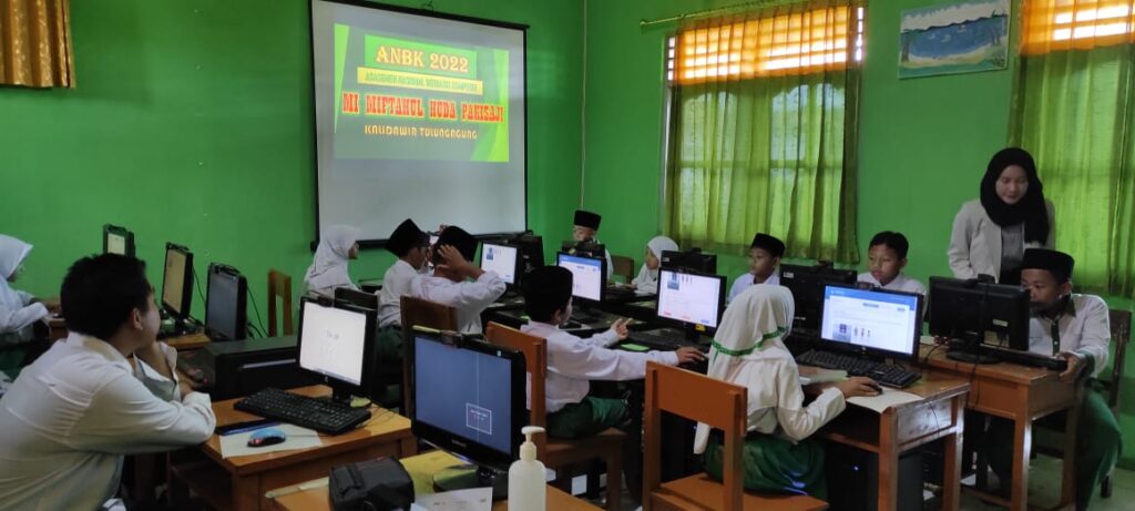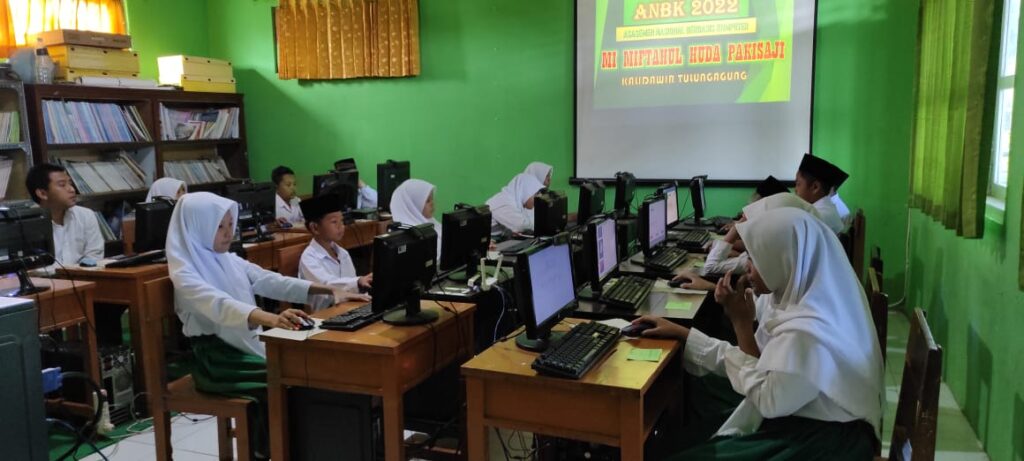 MI Miftahul Huda Pakisaji melaksanakan ANBK 2022 di Laboratorium Komputer dengan bimbingan guru.